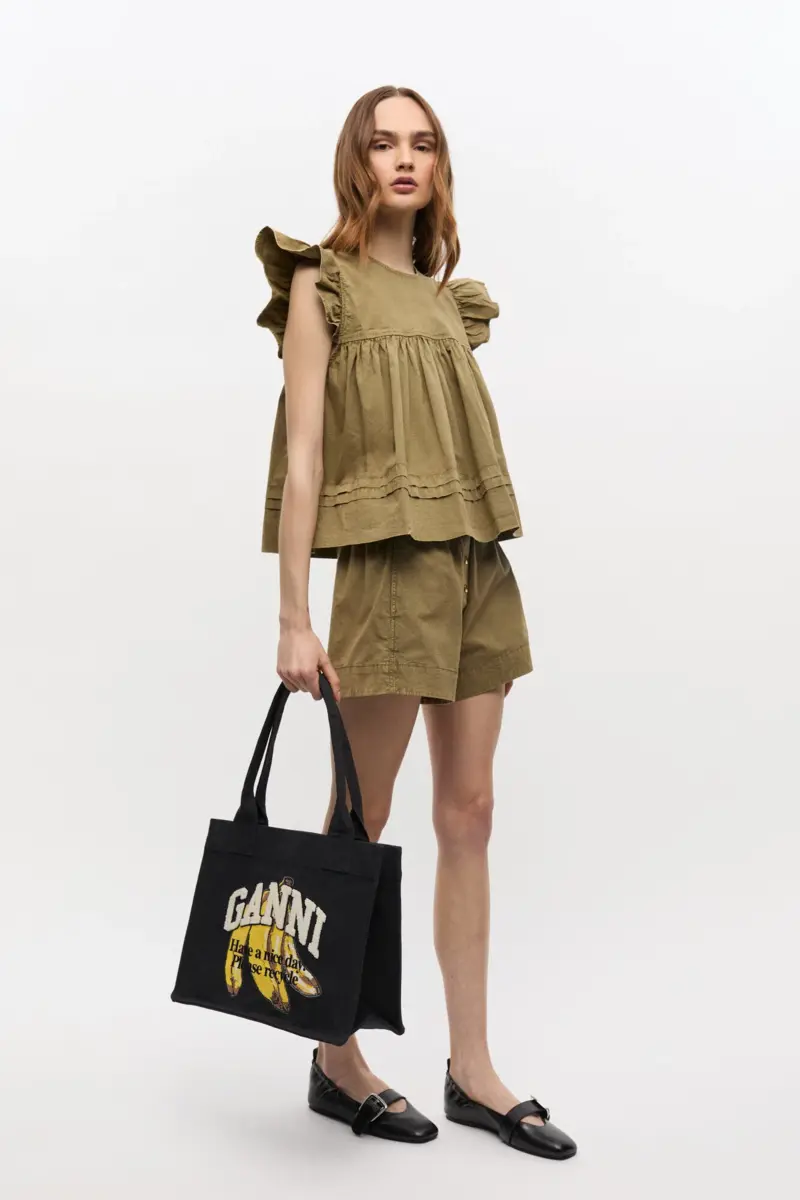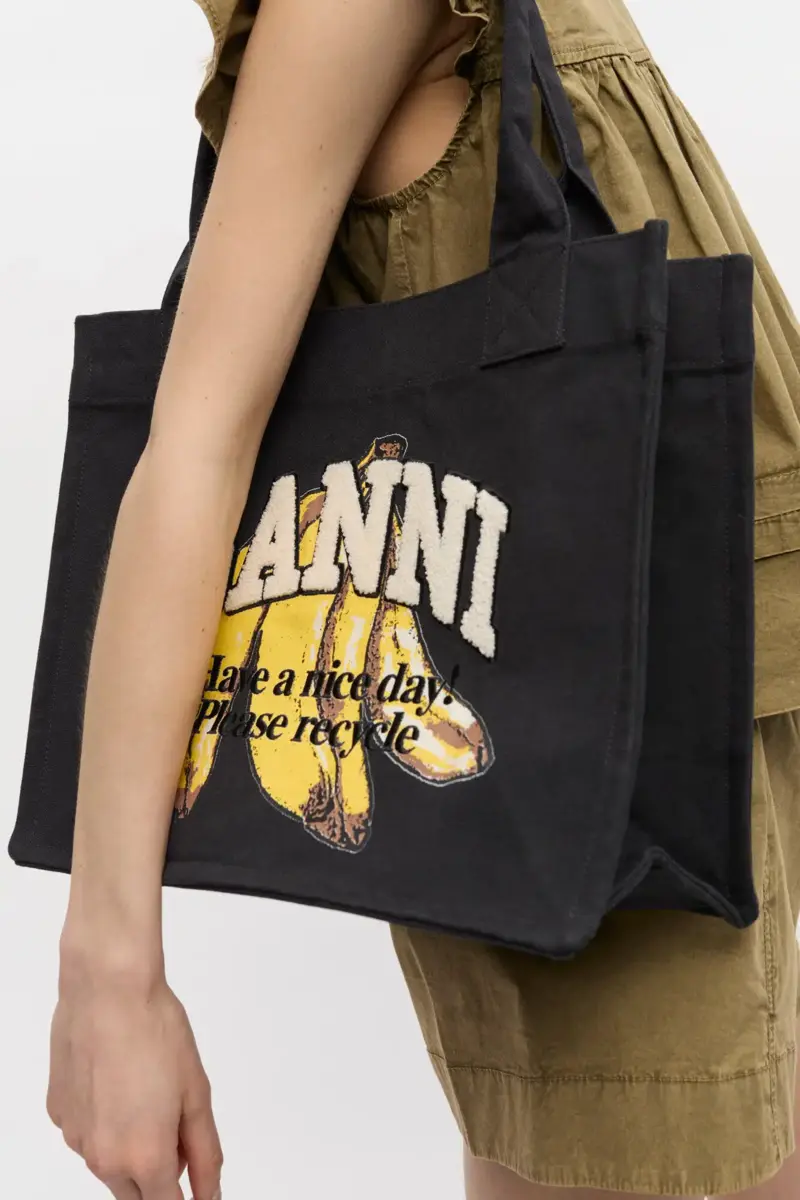 This tote bag features top handles, one large compartment, and a GANNI logo with the phrase ‘Have a nice day! Please recycle’.