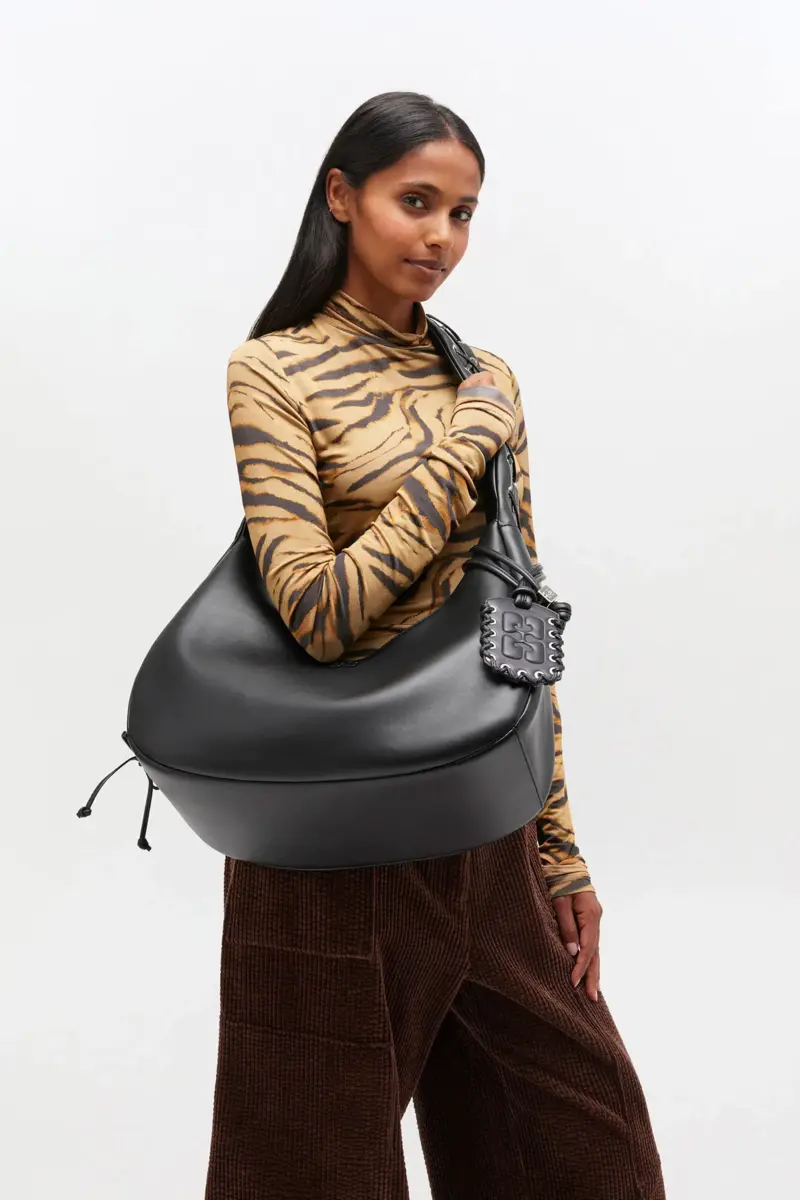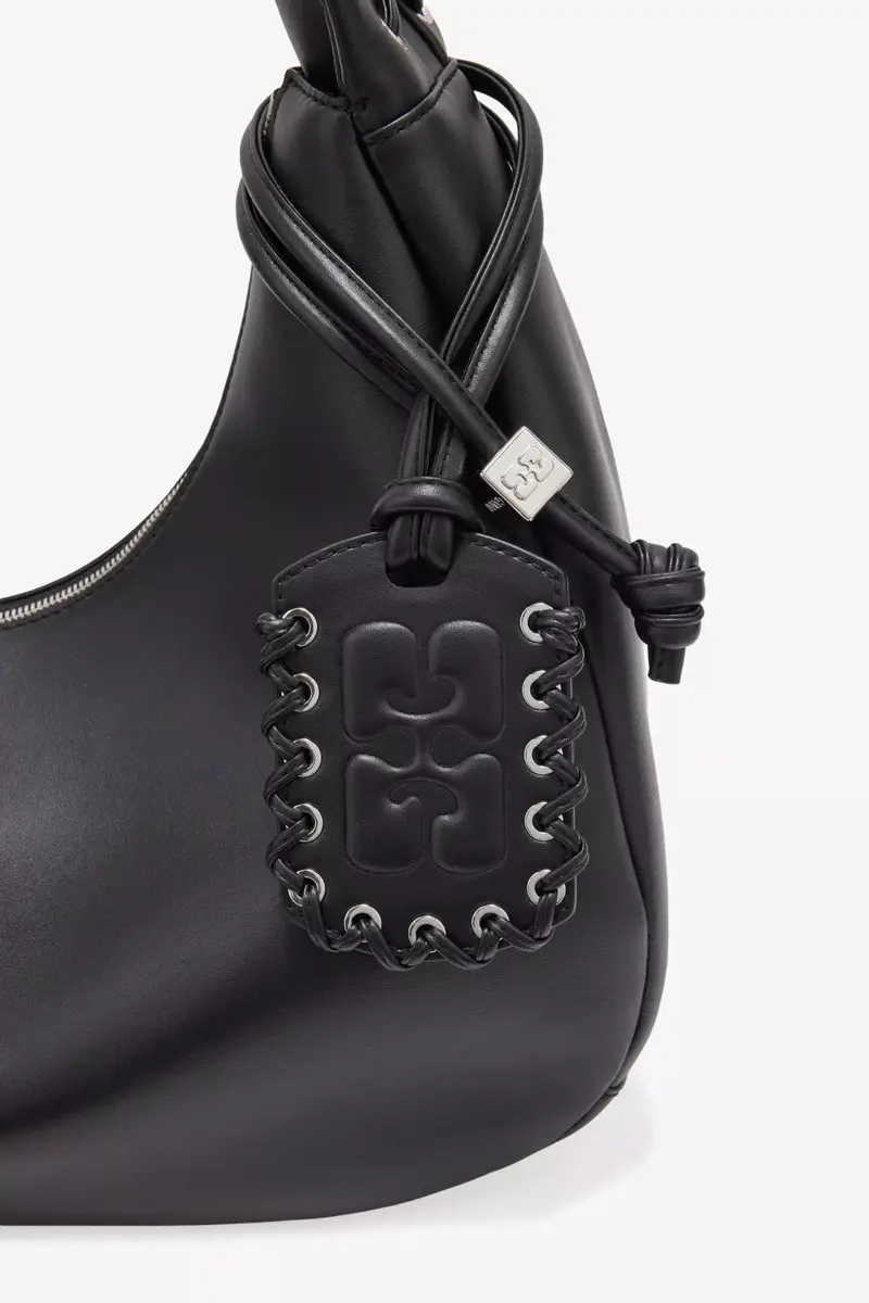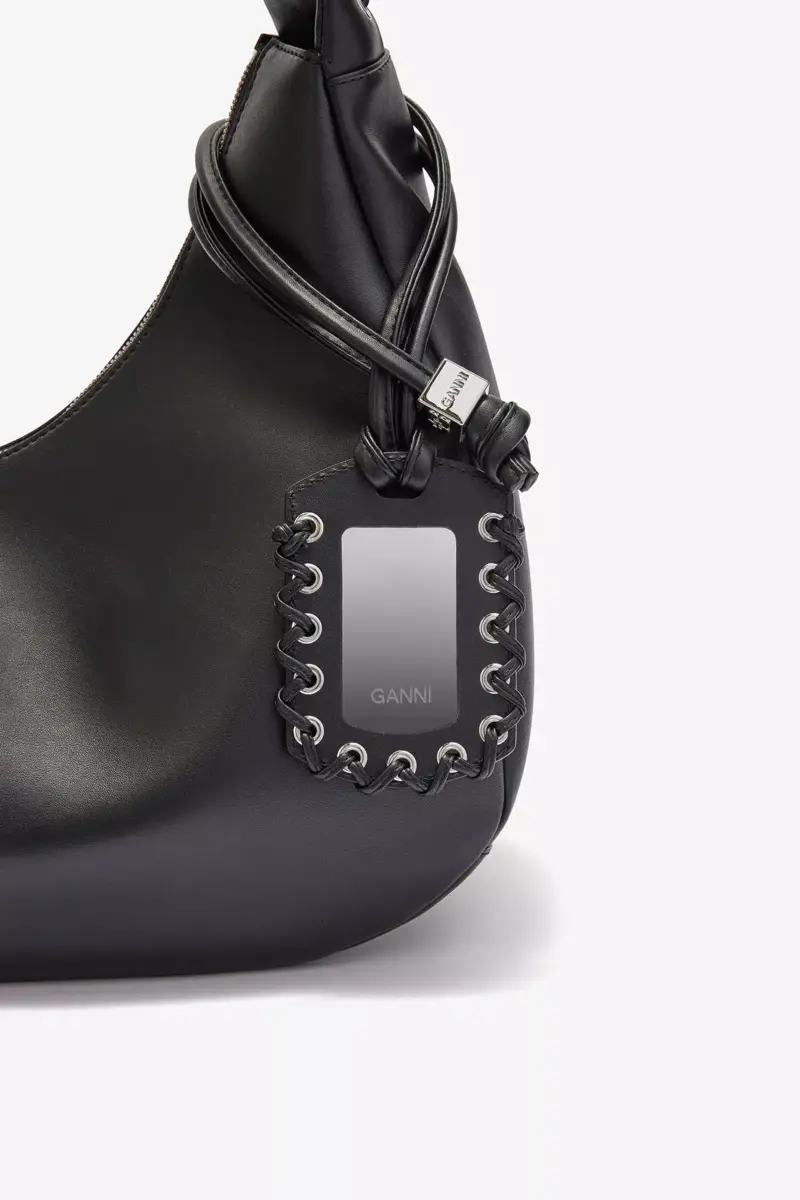 This bag features a shoulder strap, a zip closing and tone-on-tone GANNI Butterfly logo. The bag has a mirror hangtag and inside zipped pocket.