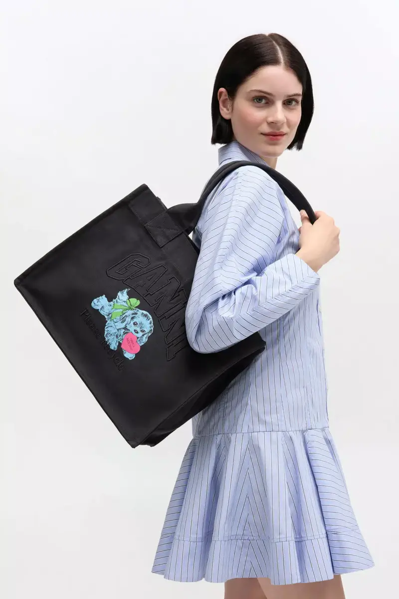 This tote bag features top handles, one large compartment, and a GANNI logo with a puppy print graphic and the phrase ‘Have a nice day! Please recycle’.
