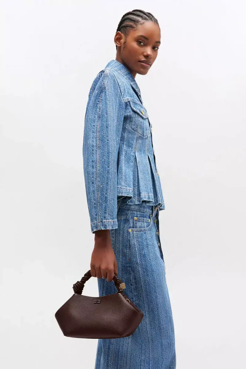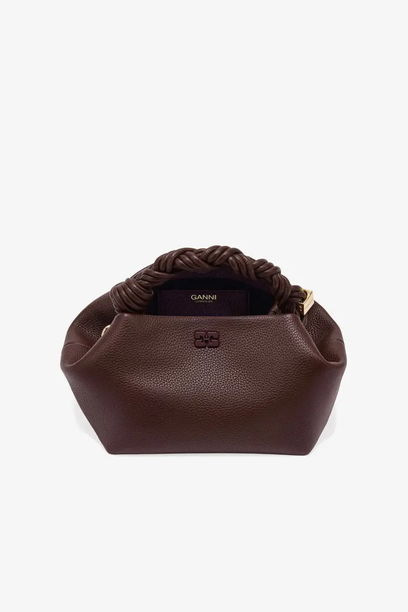 This bag features a tone-on-tone metallic GANNI Butterfly logo, a twisted handle with a braided knot, and a gold-tone metallic dice with a GANNI Butterfly logo engraved. The bag has an