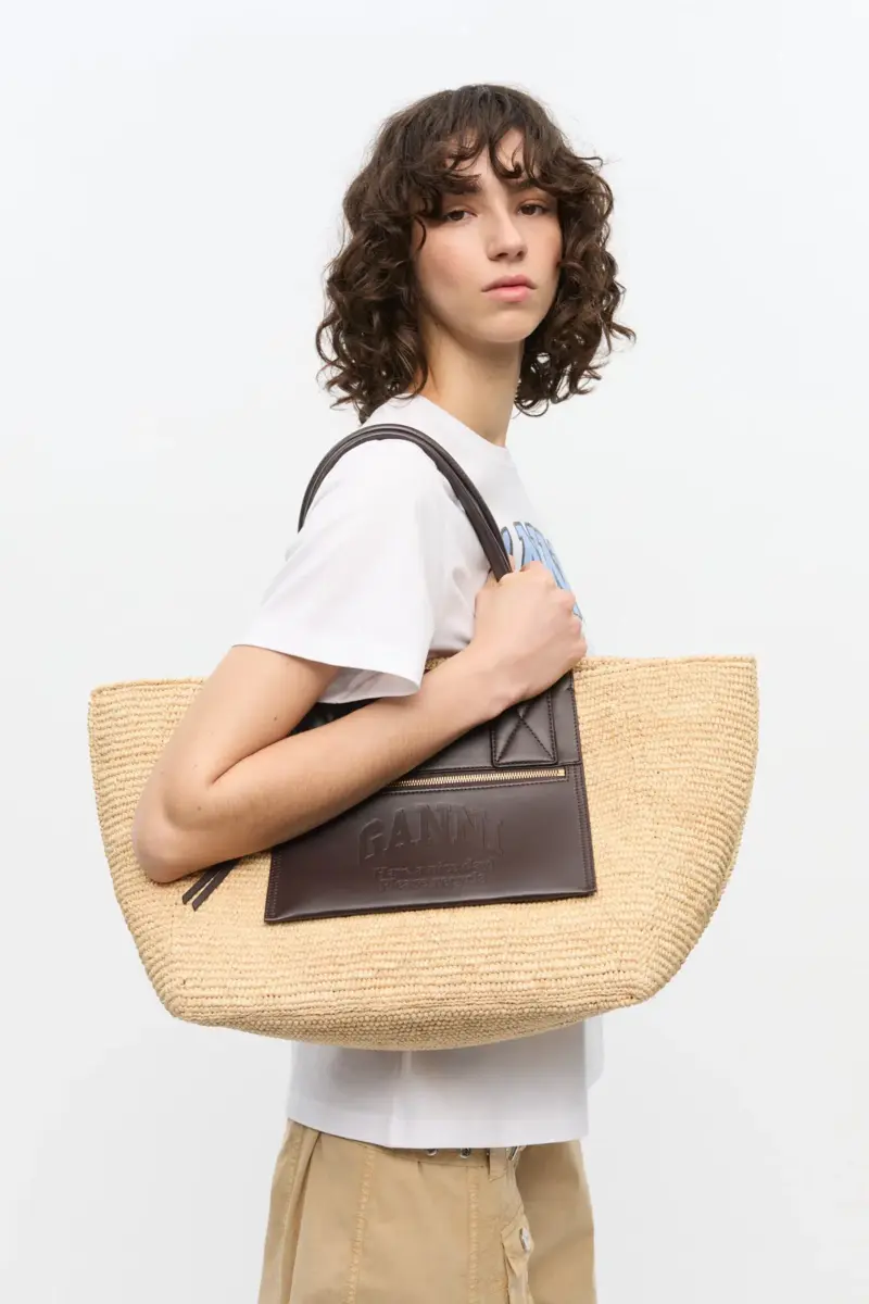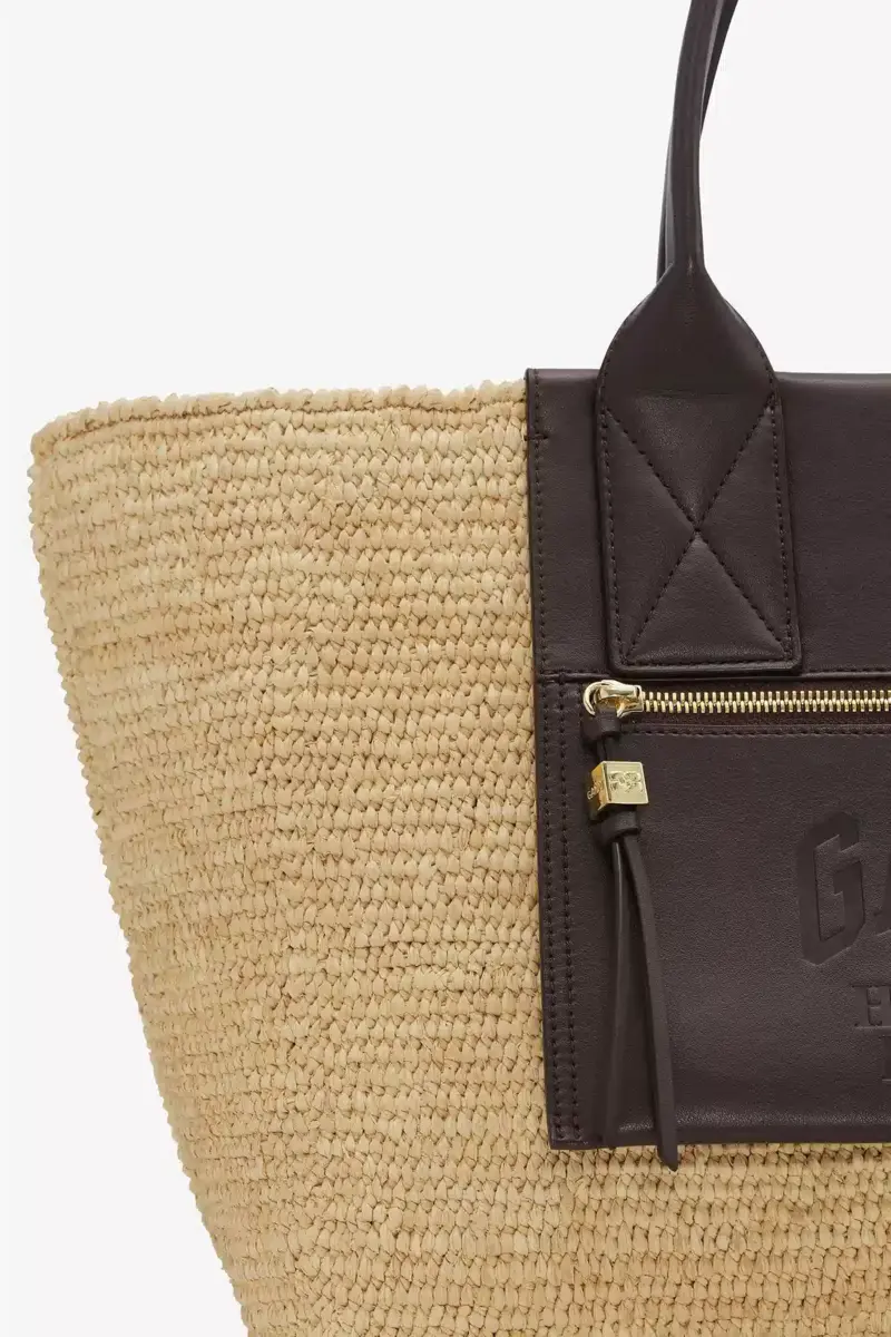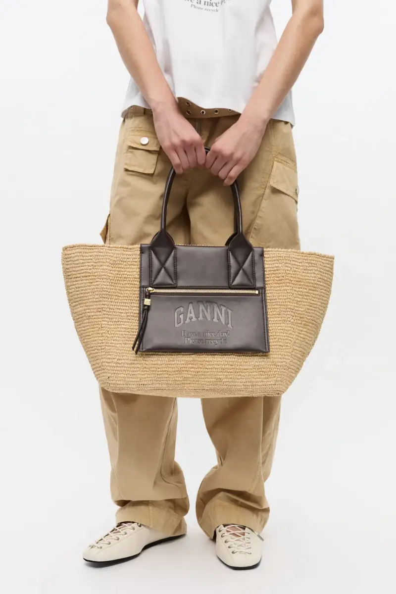 This tote features top handles and a front pocket with an embossed GANNI logo. The pocket has a zip closure and a pull tab with a gold-tone metallic dice. The outer material is made wi