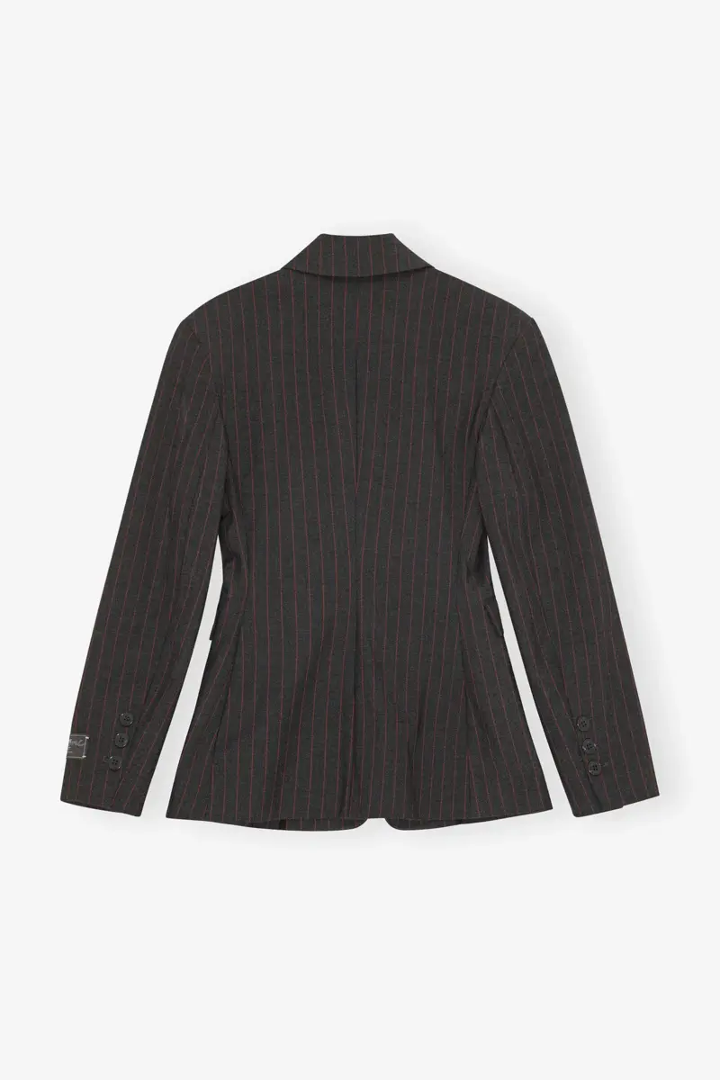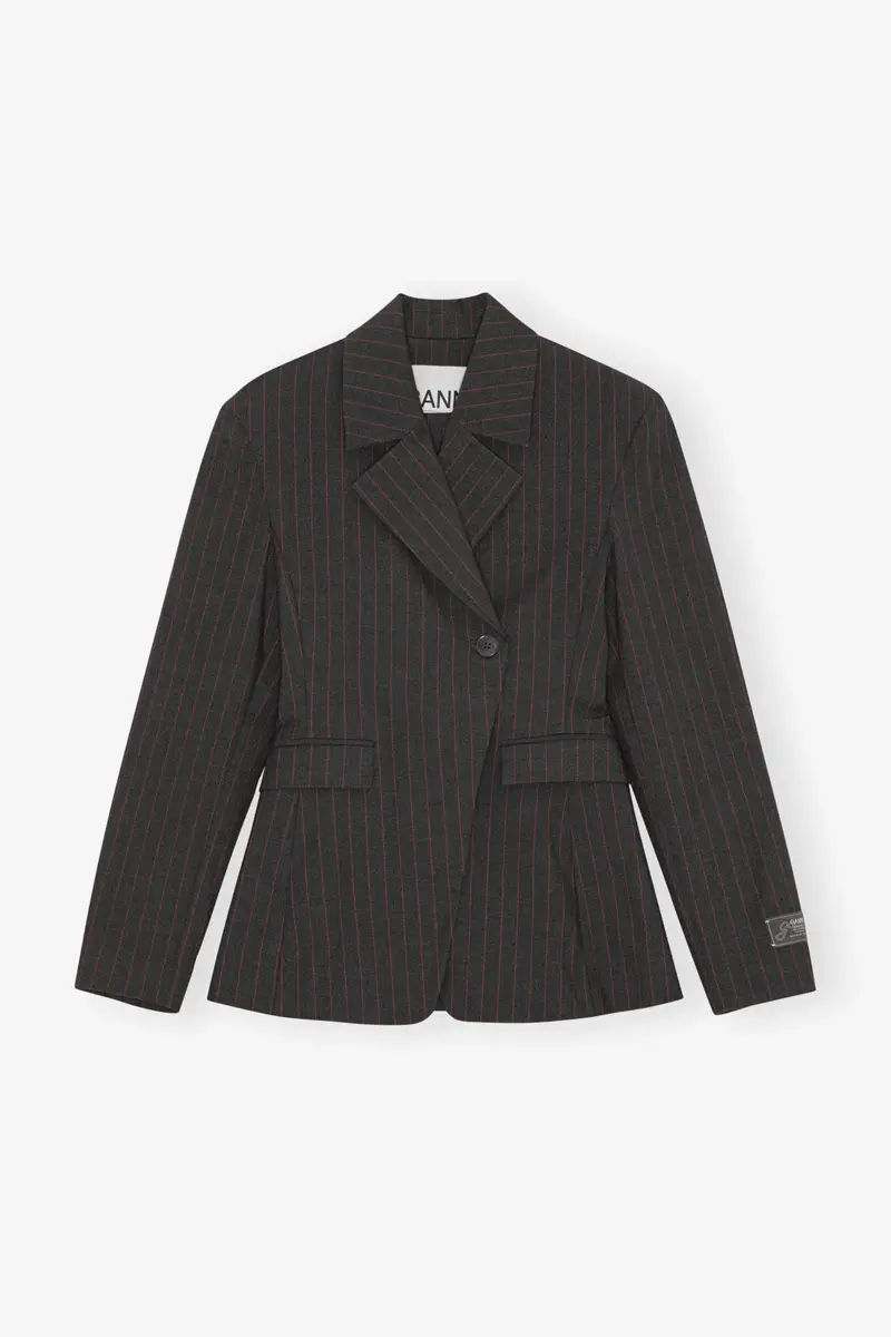 This blazer features a thin red pinstripe, a single-button closure at the front, notched lapels, two flap pockets at the waist and a GANNI patch logo.