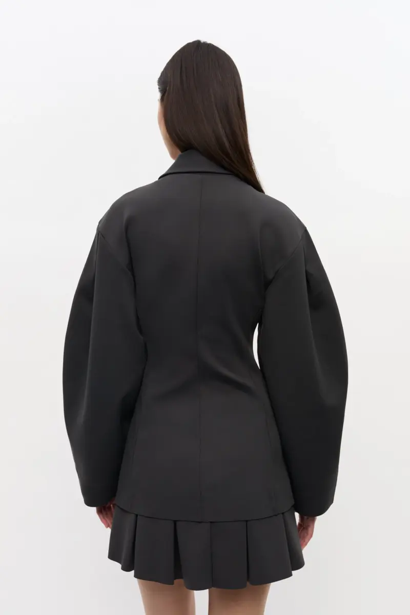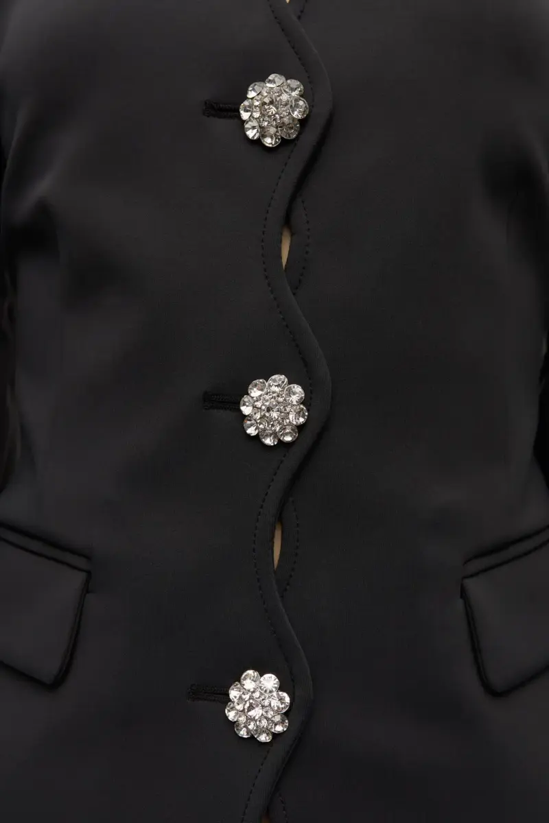 This blazer features a classic collar, curved sleeves, scalloped button-front closure with silver rhinestone buttons and 2 front pockets.