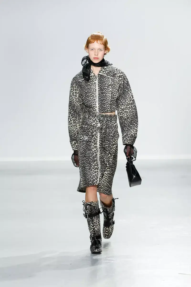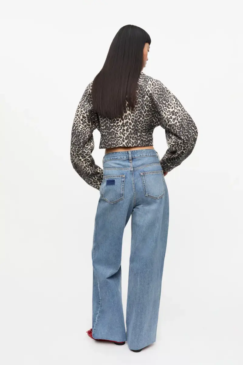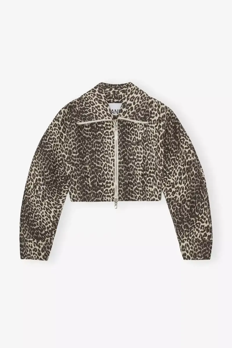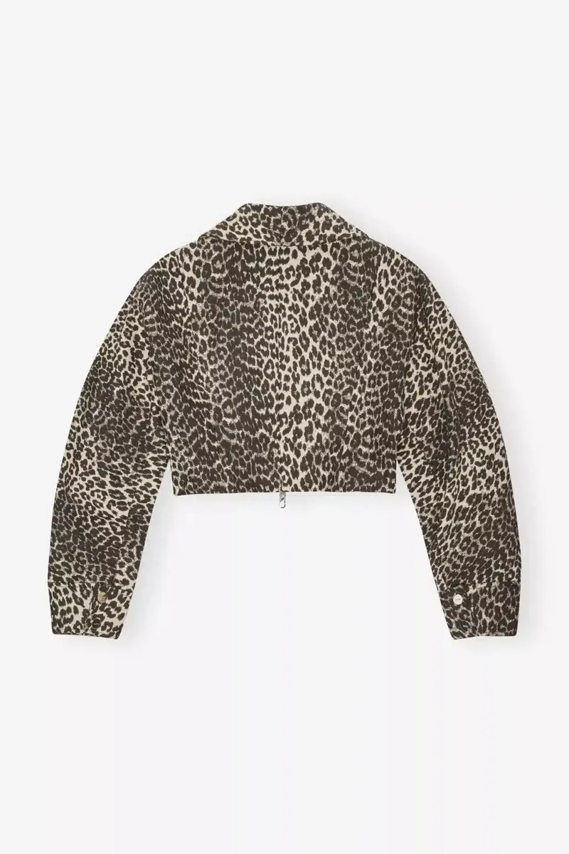 This Leopard Curve Sleeve Short Jacket features a large collar, curved sleeves and a double zip closure.