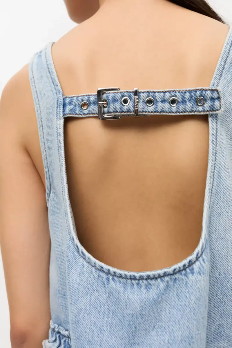 This top is sleeveless and features a square neckline, open back with a buckle detail and frill details at the hem.