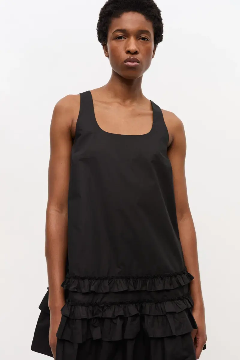 This mini dress features a U-neckline, a ruffled hem and an open back with a tie closure.