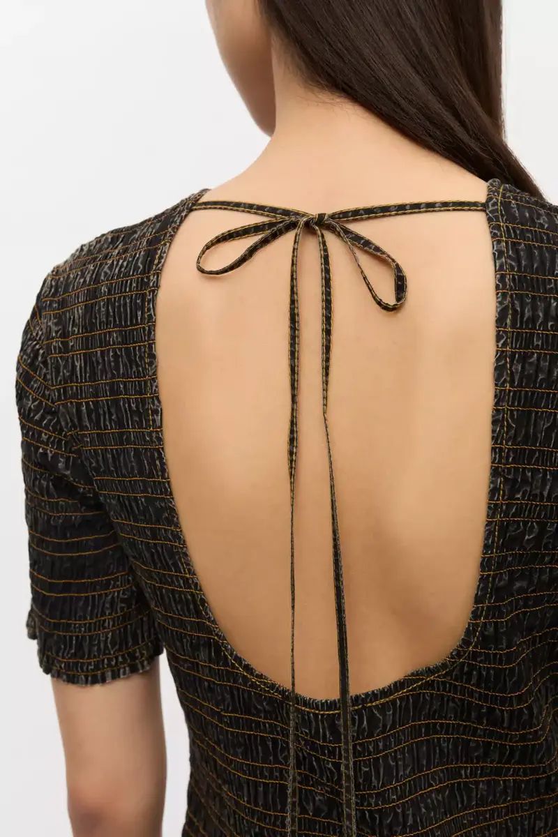 This dress features a smocked bodice with a round neckline, short sleeves and contrast stitching detailing.