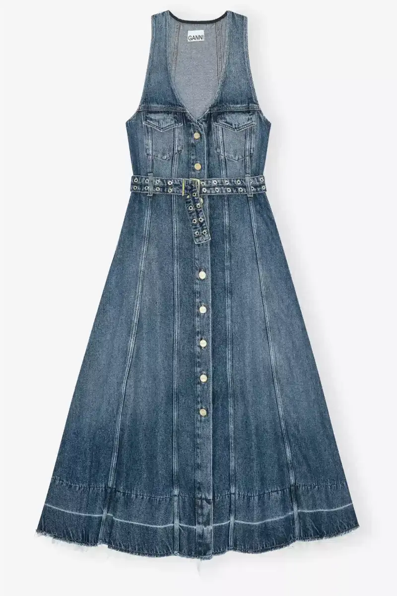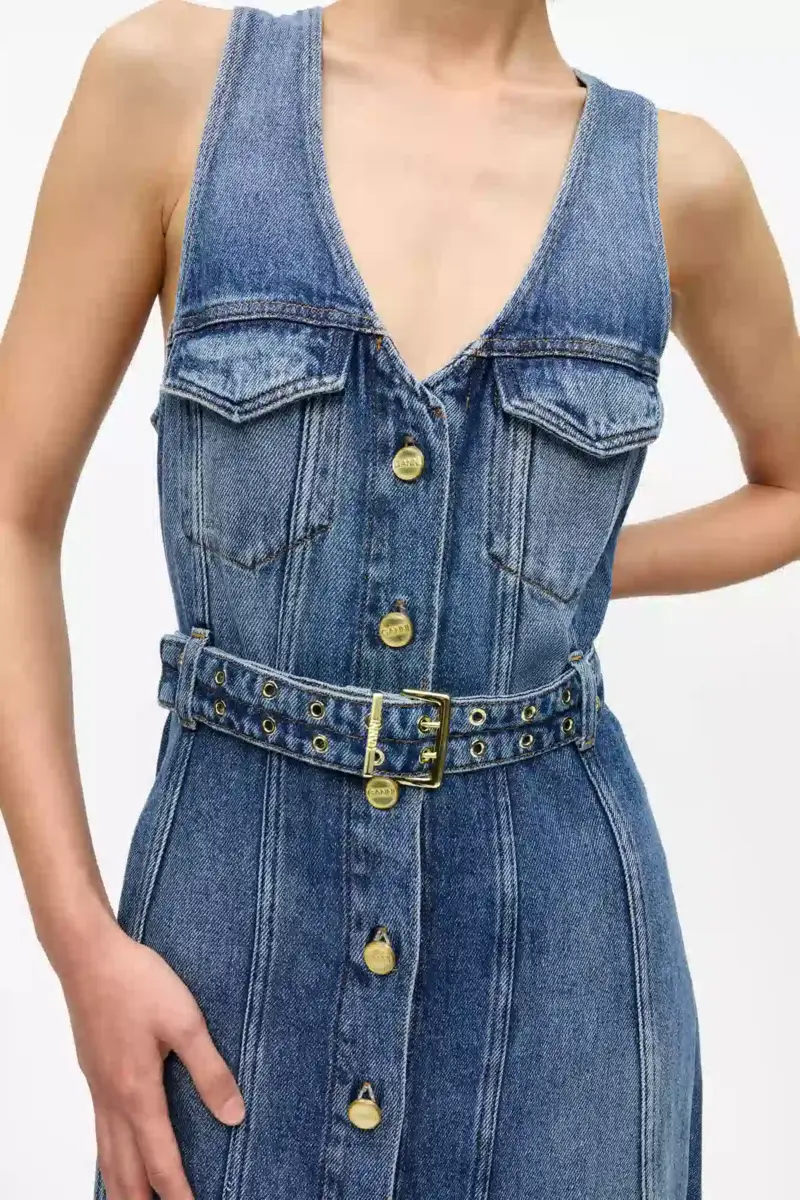This dress in denim feature a V-neckline, button front closure, chest pockets and a matching belt with metallic eyelets.