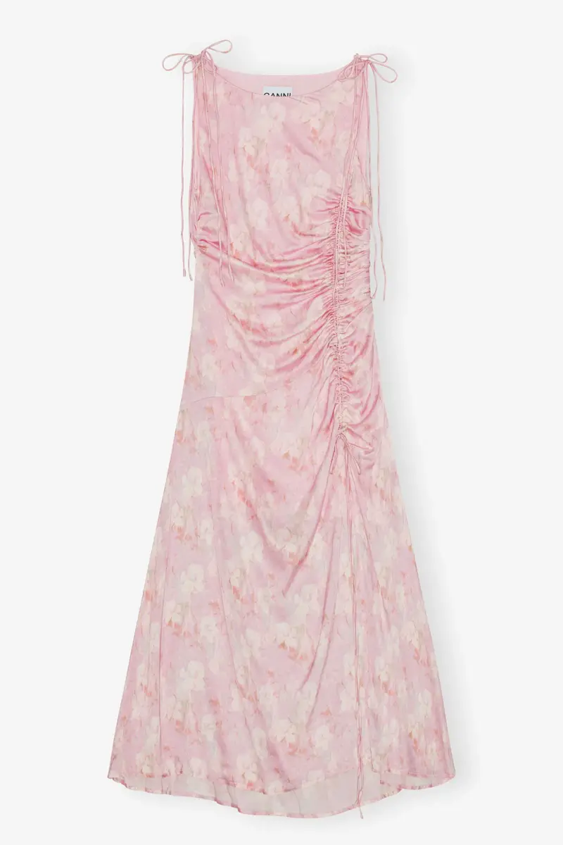 This Pink Printed Satin Gathered Dress features a round neckline with tie details and GANNI Butterfly logos, ruching along the bodice and a high slit at the front.