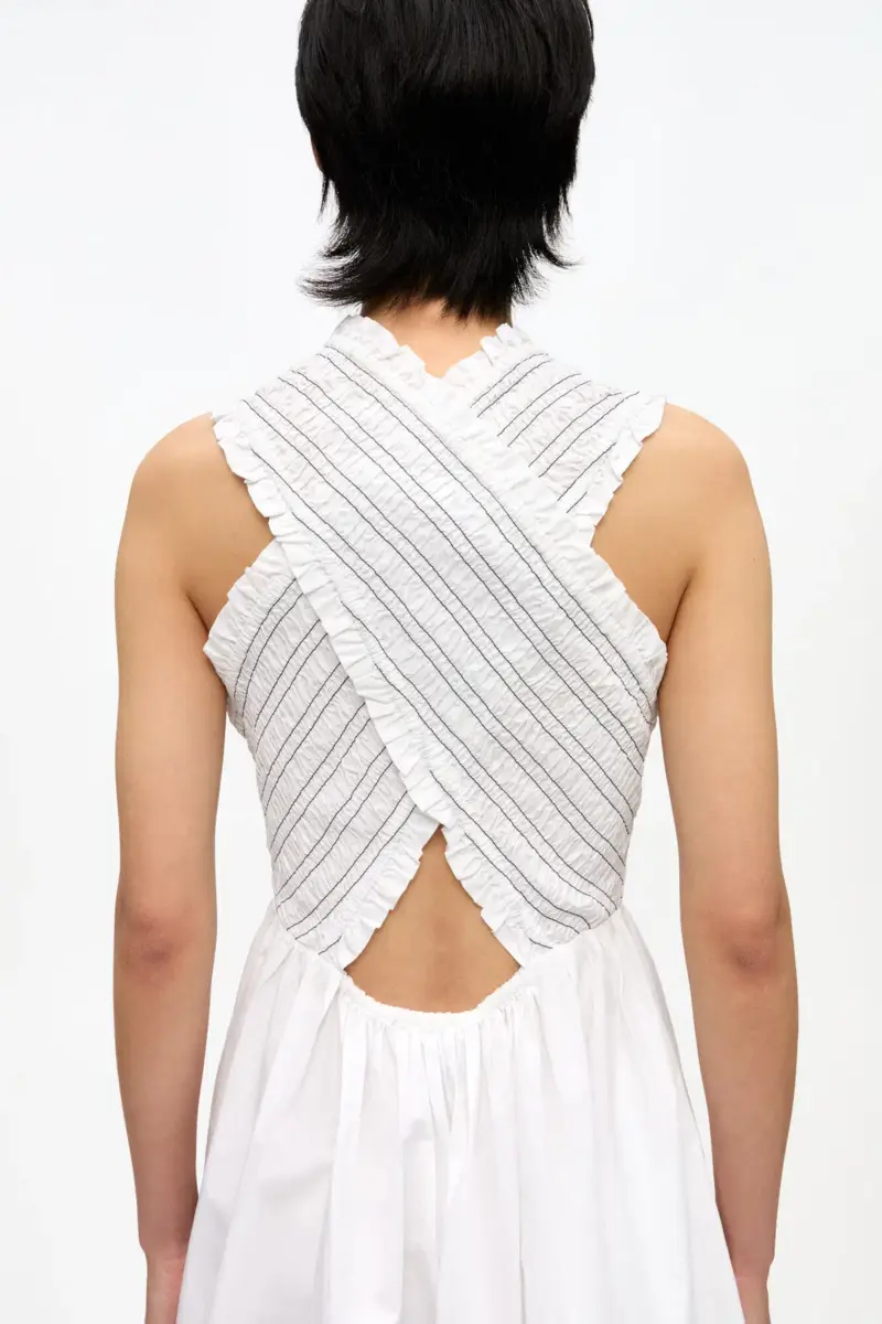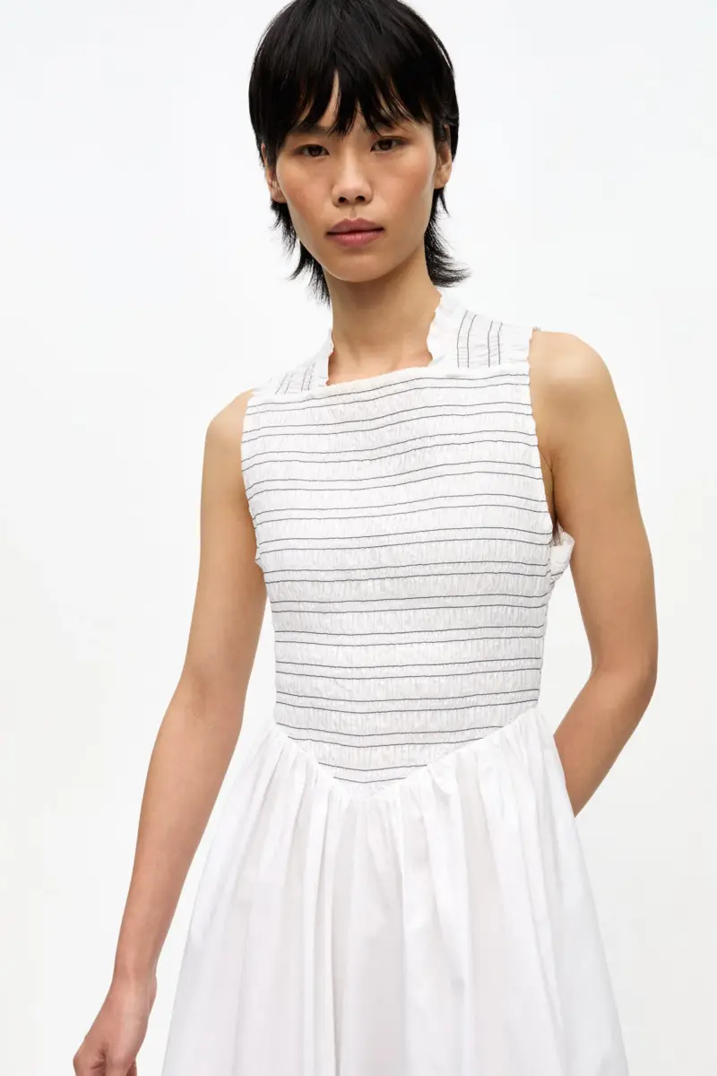 This dress features a straight neckline with wide smock straps, a smock bodice, cut-out detail at the back and a flared skirt.