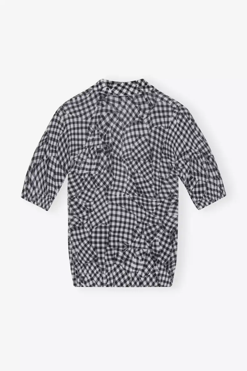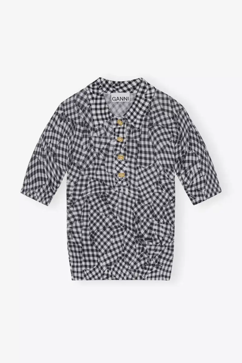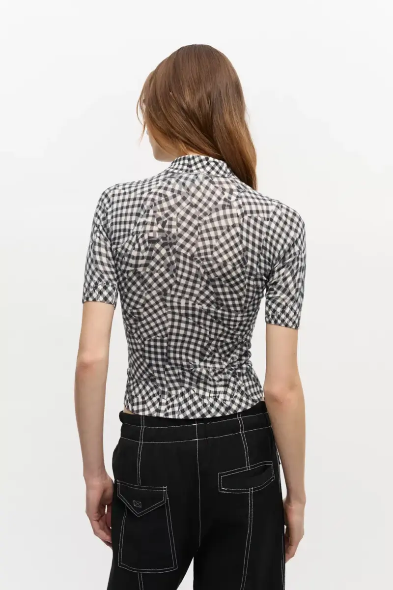 This polo features a check pattern, a buttoned front and a pointed collar.
