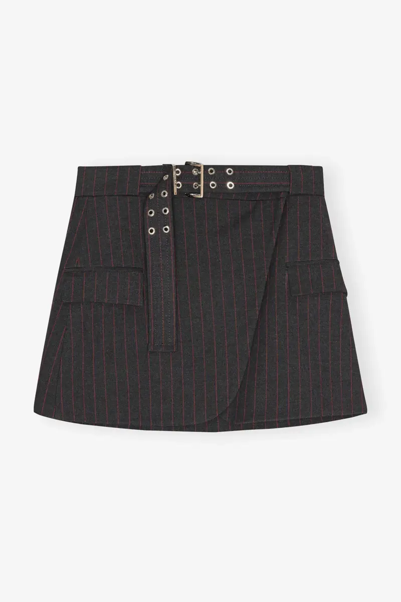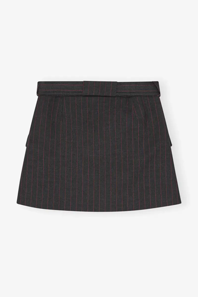 This skirt features a thin red pinstripe design, a matching belt with metallic eyelets and front pockets.
