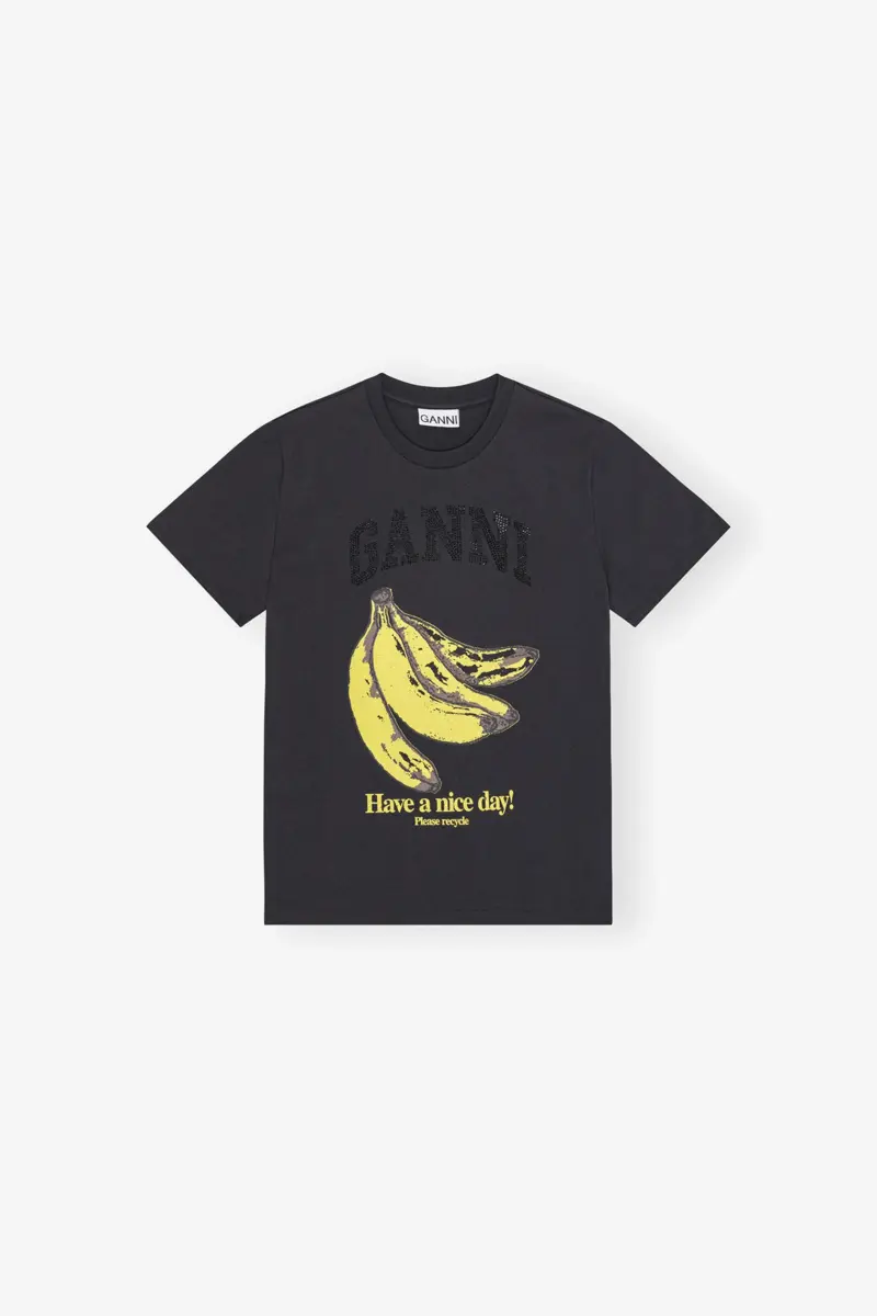 ThisT-shirt features a round neckline, short sleeves and a GANNI logo written in black rhinestones. The T-shirt has a banana graphic on the front with a ‘Have a nice day! Please recycl