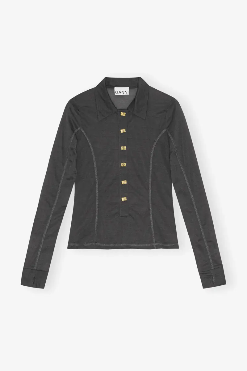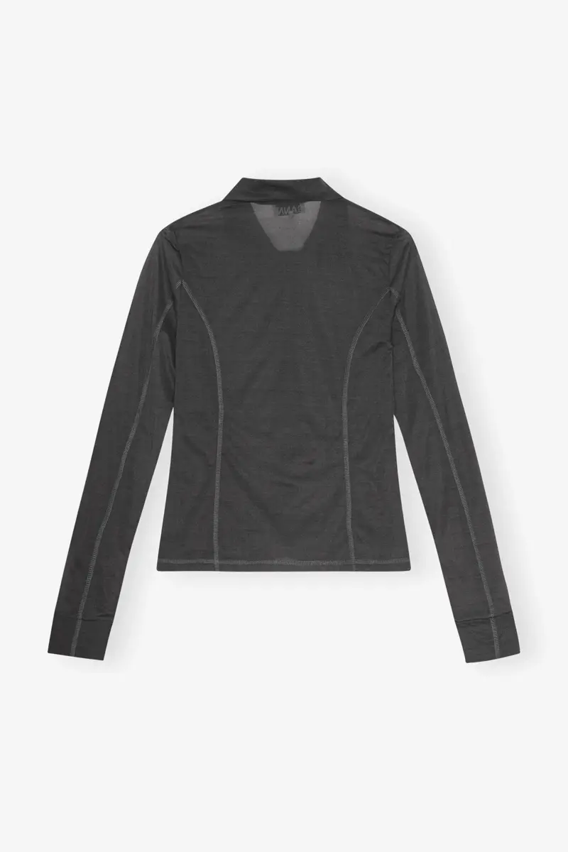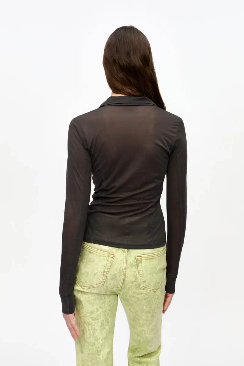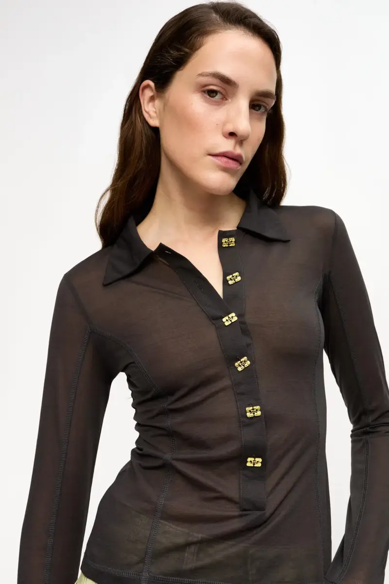 This Black Sheer Mesh Jersey Buttoned Collar Top features a collar, button closure at the front and long sleeves.