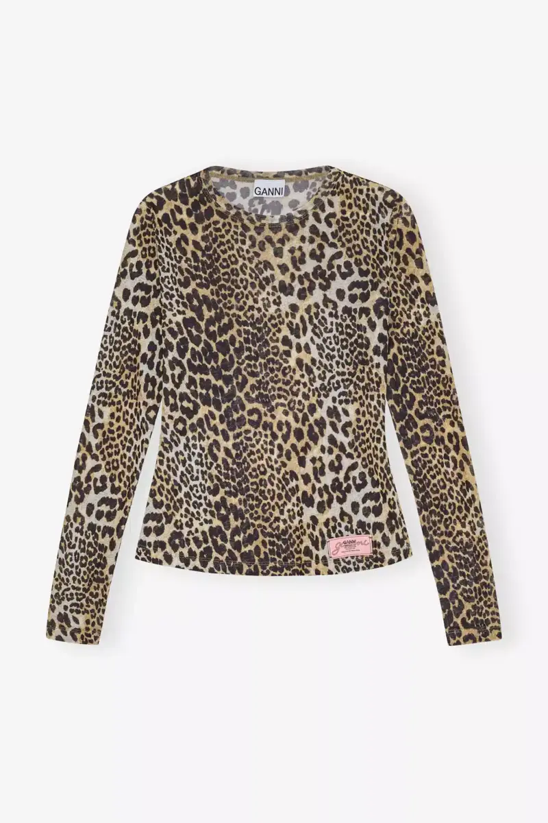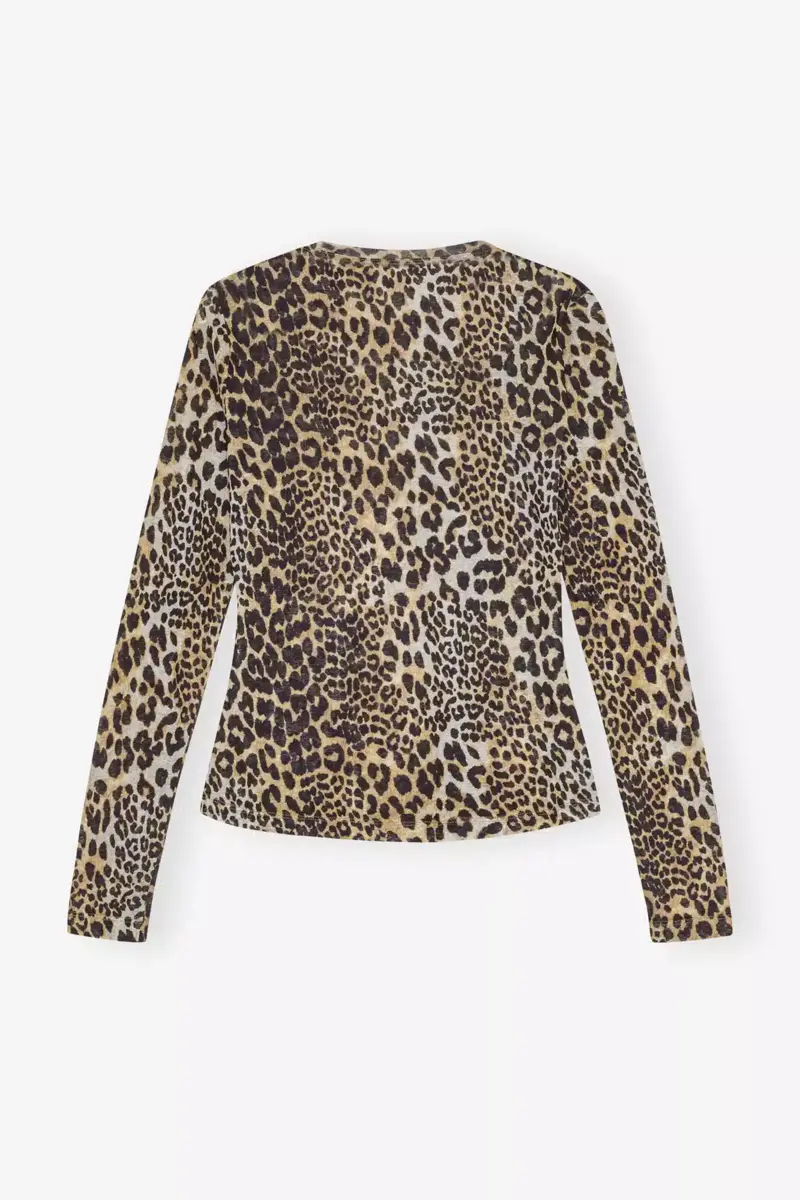 This Printed Mesh Long Sleeve Top features a leopard print print. The blouse has long sleeves, a fitted silhouette, and a lightweight design.