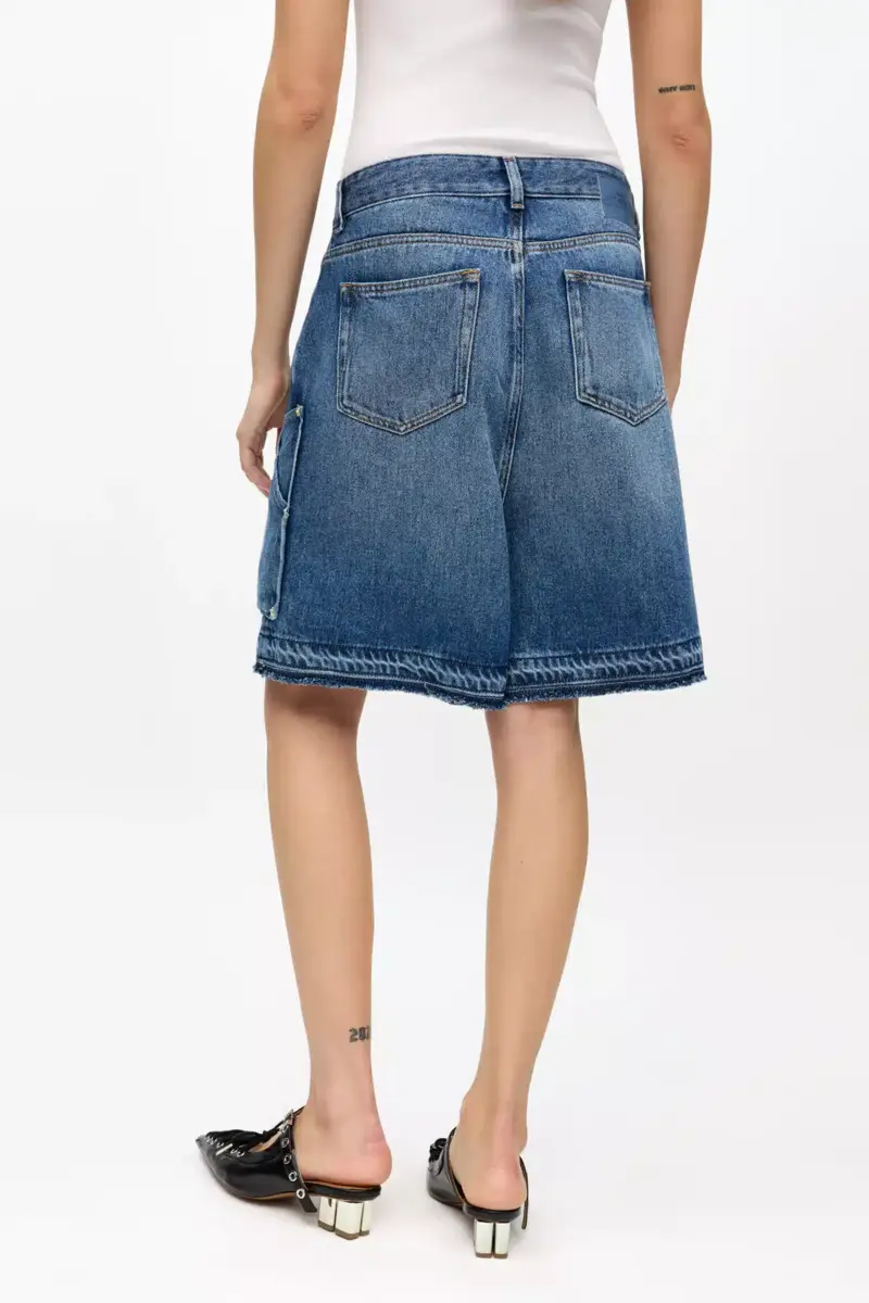 These shorts in denim feature a zip and button closure, 5 pockets and a cargo pocket on the side.