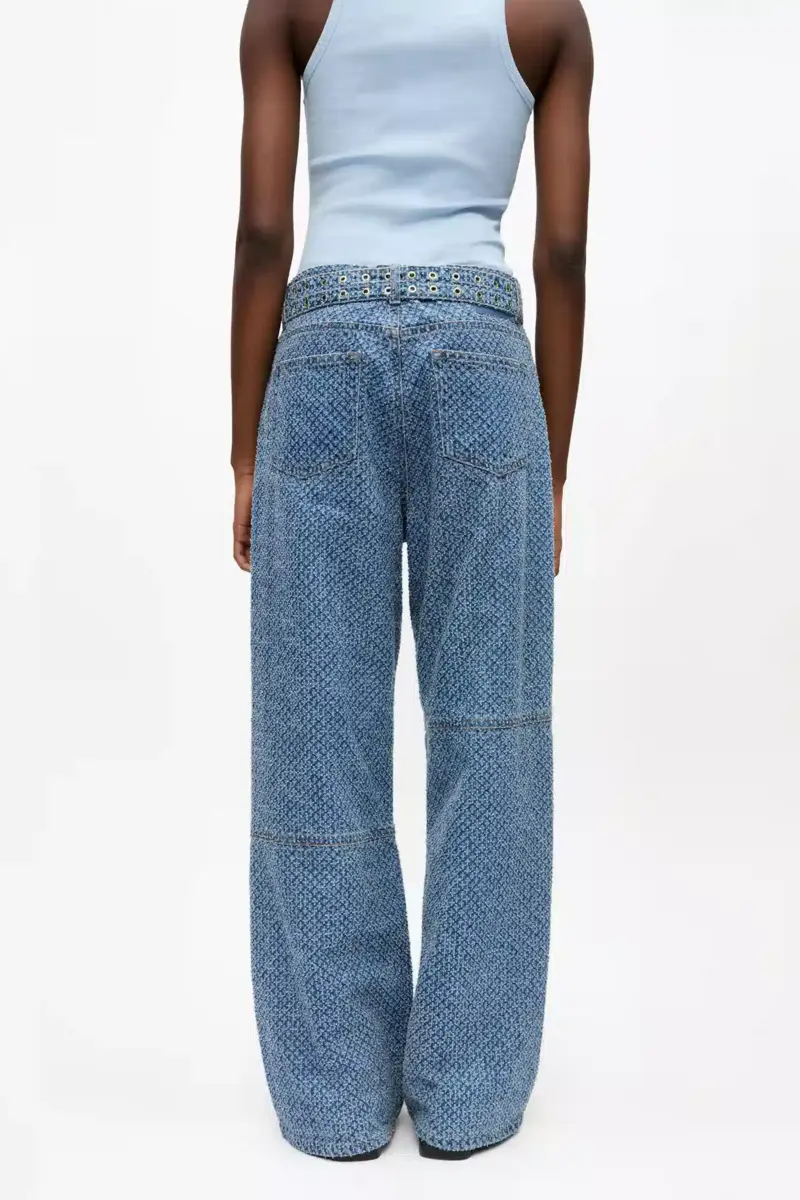 These jeans in textured denim feature a zip and button closure, 5 pockets, belt loops, GANNI logo patch on back pocket and belt detail.