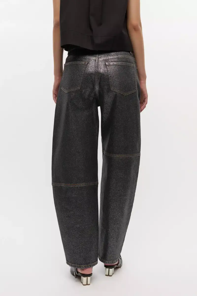These jeans feature a shimmery foil finish, zip and button closure, 5 pockets, belt loops and a GANNI logo at the back.